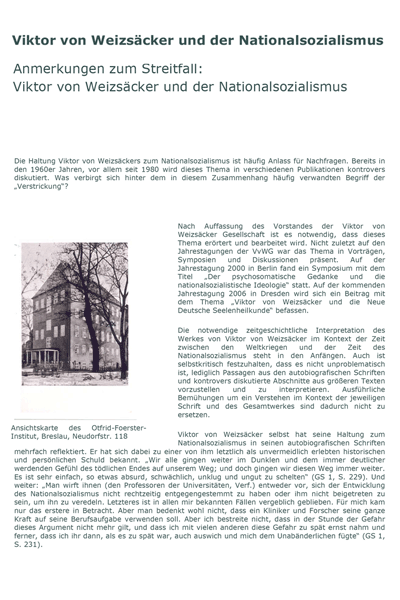 Für jeden, der V. v. Weizsäckers Begründung einer Medizinischen Anthropologie auch heute noch für aktuell und bedeutsam hält, mag es die viel beunruhigendere Einsicht sein, dass V. v. Weizsäcker zwar kein Anhänger der Politik der Nationalsozialisten gewesen ist, ihn dies aber keineswegs von einer Mitverantwortung als Breslauer Institutsleiter entlastet. Sein Bemühen um eine Medizin, die den kranken Menschen nicht als Objekt medizinischer Therapie, sondern als Subjekt wahrnimmt und respektiert, hat ihn nicht davor geschützt, zu diesen Patientenmorden zu schweigen und damit Mitverantwortung zu tragen. Zwar gibt es keine Belege dafür, dass ihm als Institutsleiter die Hintergründe der Untersuchungen seines Neuropathologen bekannt waren. Es mag allerdings viel dafürsprechen. In jedem Falle aber hätte er es wissen müssen.