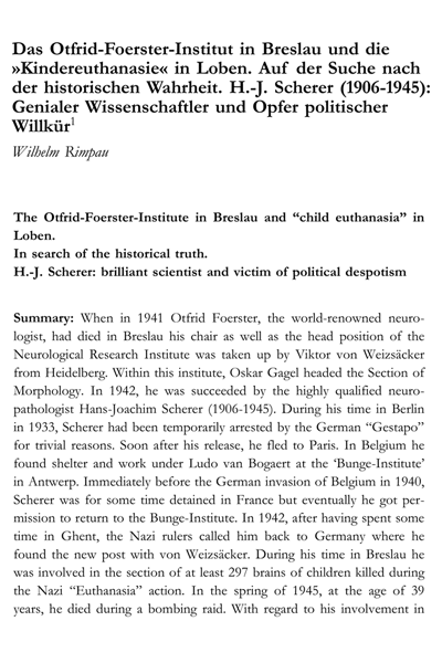 Rimpau W (2021). Das Otfrid-Foerster-Institut in Breslau und die "Kindereuthanasie" in Loben. Auf der Suche nach der historischen Wahrheit. H.-J.Scherer ( 1906-1945): Genialer Wissenschaftler und Opfer politischer Willkür. In: Holdorff B & W. Rimpau ( 2021). Neurowissenschaftler im Zwielicht während der NS-Zeit in Berlin-Buch und Breslau. Peter Lehmann Publishing, Berlin/Lancaster, S.32-55, 2021